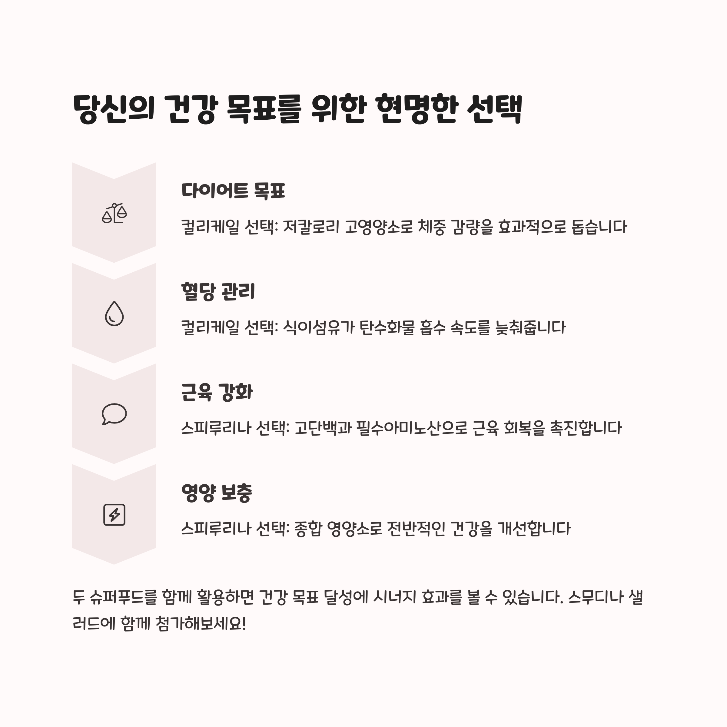 항산화, 피부 노화 방지, 혈당 조절이 우선이라면 컬리케일을 추천합니다. 반면에 근육 강화, 에너지 보충, 해독이 목표라면 단연 스피루리나가 좋은 선택이죠. 물론 둘 다 균형 있게 섭취하면 더 강력한 시너지를 기대할 수 있습니다. 건강 목표에 따라 똑똑하게 선택해보세요!