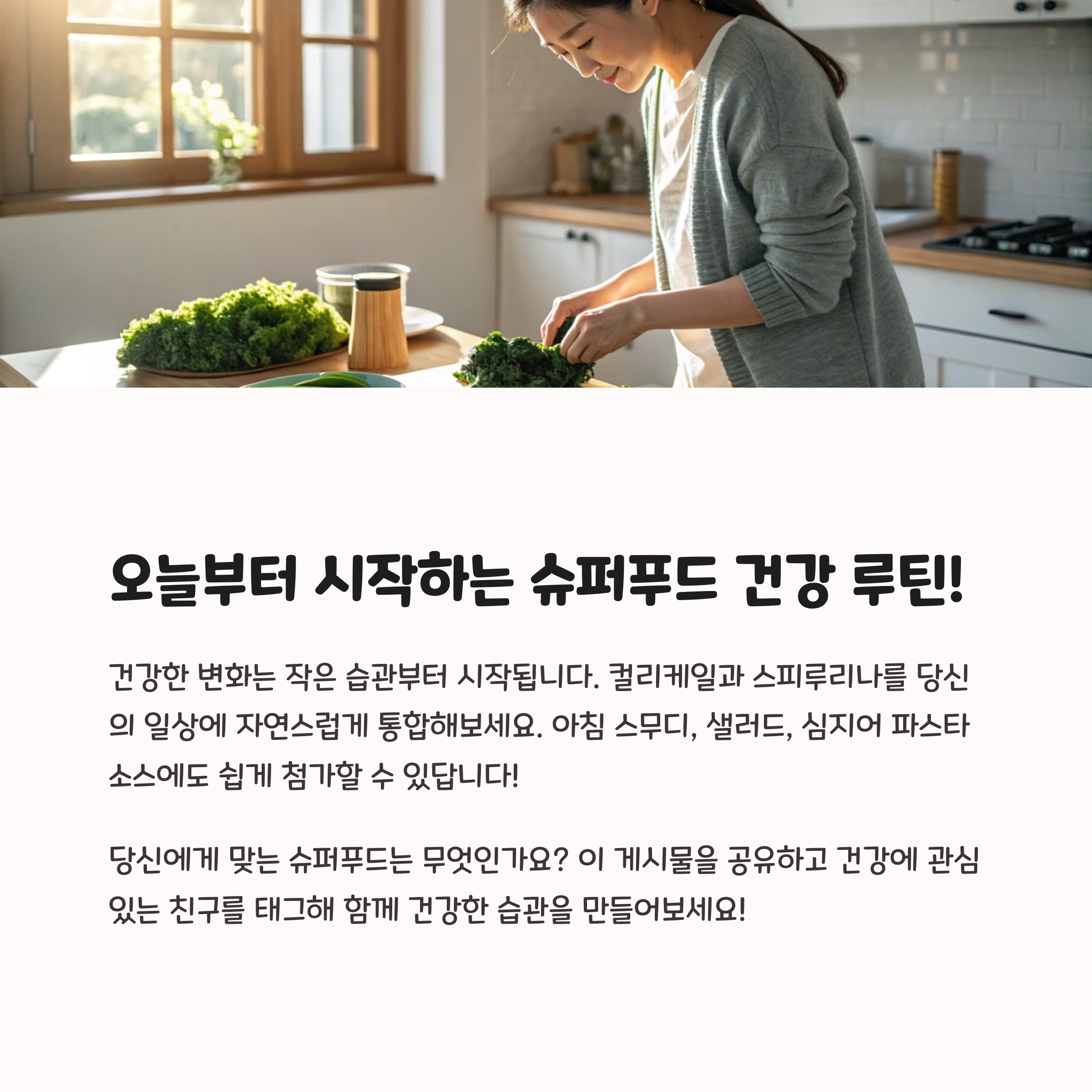 컬리케일과 스피루리나, 둘 다 제가 직접 경험해보니 확실히 다르게 느껴지는 장점이 있었어요. 컬리케일은 아침 스무디로, 스피루리나는 운동 전 에너지 부스터로 활용했는데요, 꾸준히 먹으면서 체력과 피부 컨디션 모두 좋아진 걸 체감할 수 있었어요. 내 몸이 필요로 하는 것을 정확히 알고 선택하는 것, 건강관리의 첫걸음이라는 걸 다시 느꼈습니다. 여러분도 나에게 맞는 슈퍼푸드를 똑똑하게 선택해서, 매일 조금씩 더 건강해지는 변화를 느껴보세요!