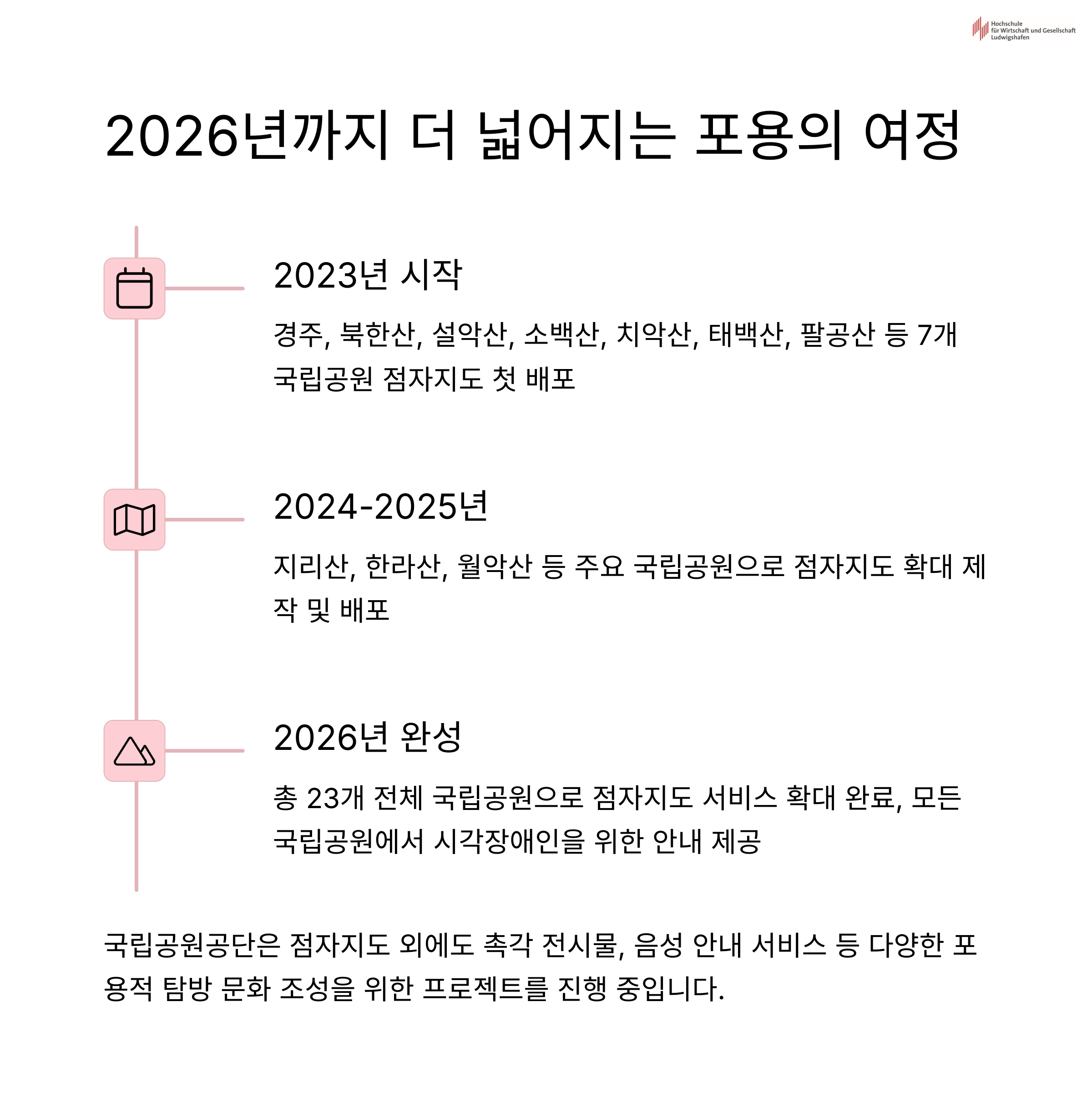 이번 점자지도 배포는 단순히 일회성 프로젝트로 끝나는 것이 아닙니다. 국립공원공단은 향후 2년 안에 전국 모든 국립공원으로 이 서비스를 확대하겠다는 계획을 발표했습니다. 단계적으로 확대되며, 각 지역별 특성에 맞춰 내용도 현지화될 예정이라고 합니다.