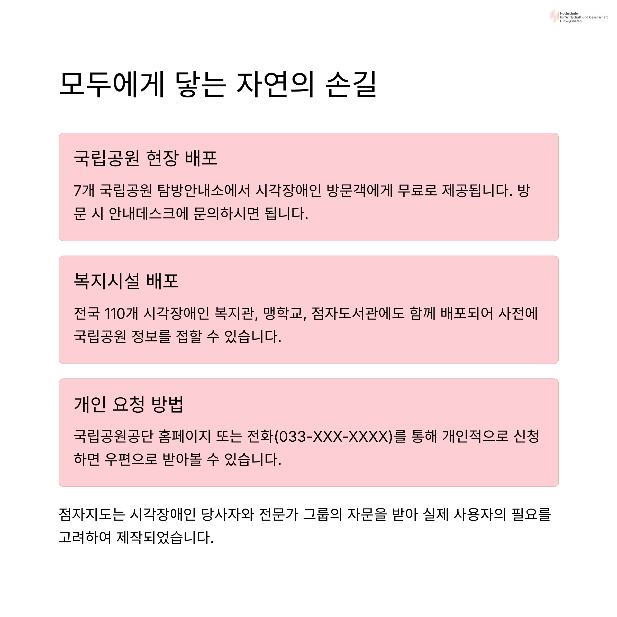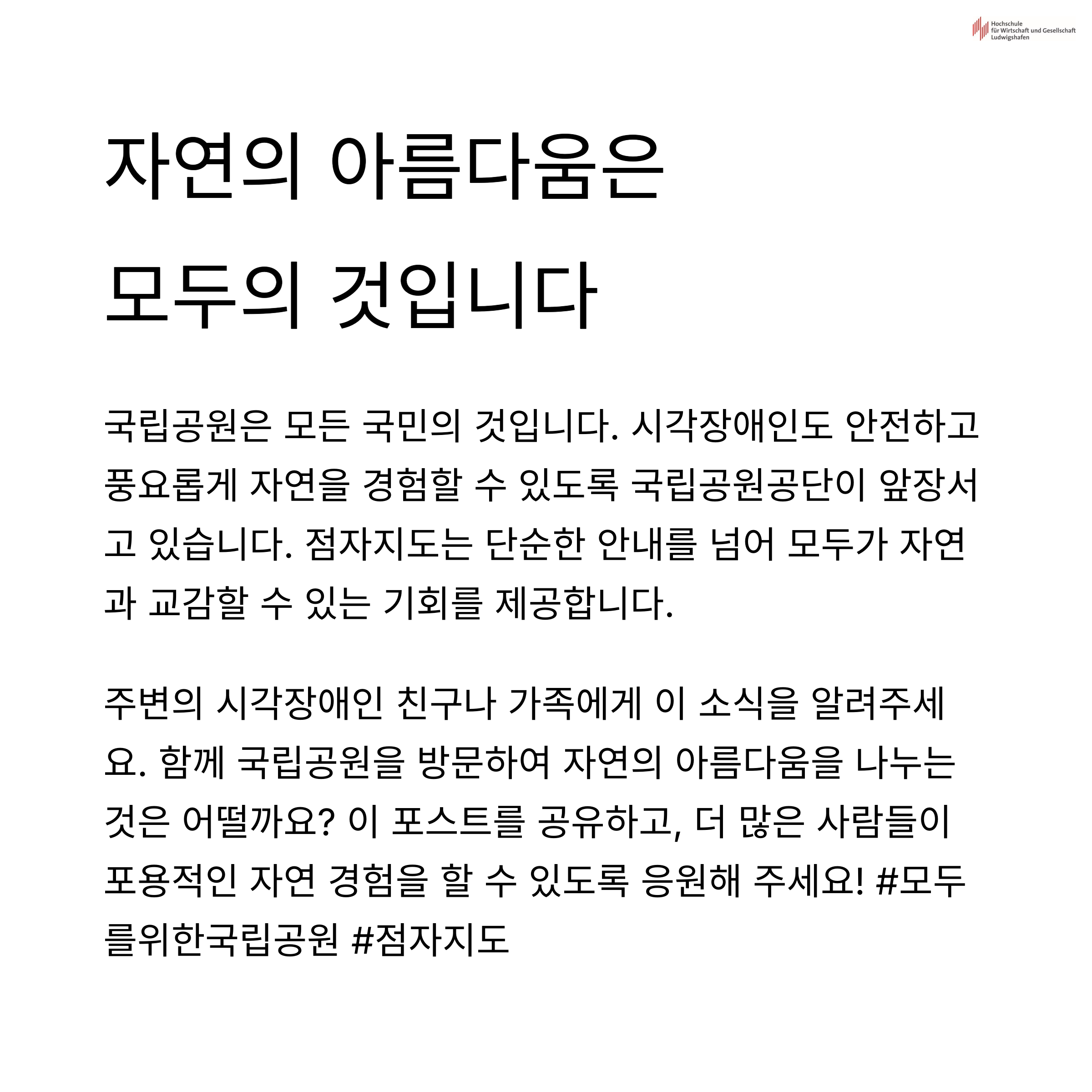 앞으로 더 많은 공공기관이 이런 방식으로 소외 없는 서비스를 고민해주기를 바랍니다. 그리고 우리가 누리는 자연이 소수의 것이 아닌, 모두의 것이 되길 바랍니다.