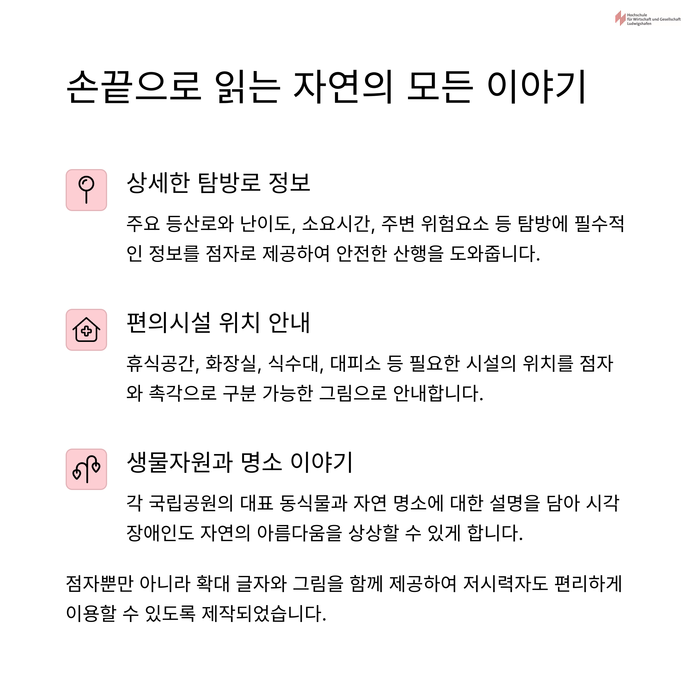 탐방로 정보, 공원 위치, 편의시설, 대표 생물, 명소 이야기 등이 포함되어 있으며, 점자·글자·그림으로 구성됩니다.